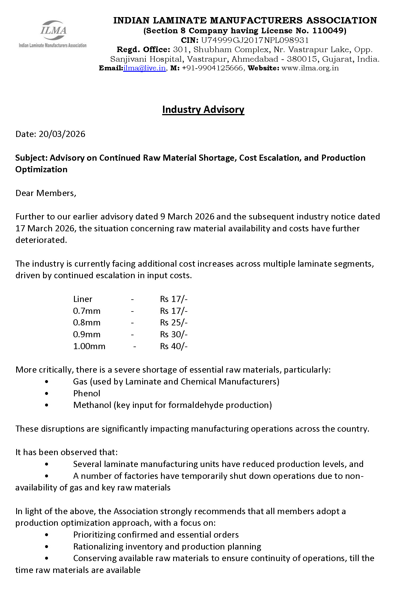 As per ILMA, the situation concerning raw material availability, the industry is currently facing additional cost increases across multiple laminate segments such as Liner, 0.7mm, 0.8mm 0.9mm, 1.00mm by Rs 17, 25, 30 and 40 respectively.