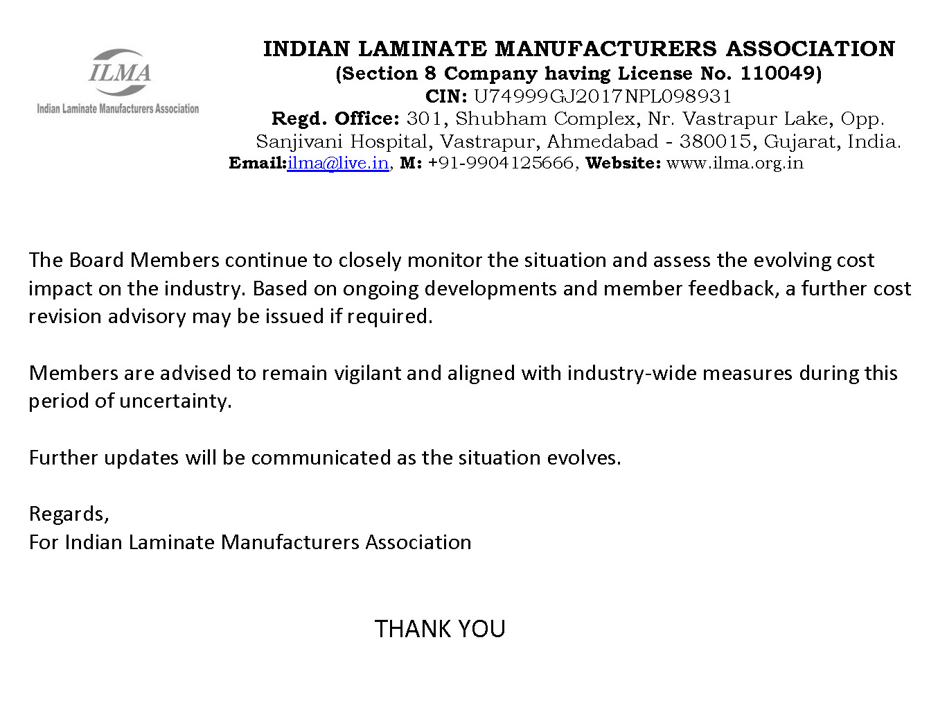 The Board Members continue to closely monitor the situation and assess the evolving cost impact on the industry. Based on ongoing developments and member feedback, a further cost revision advisory may be issued if required. Members are also advised to remain vigilant and aligned with industry-wide measures during this period of uncertainty.